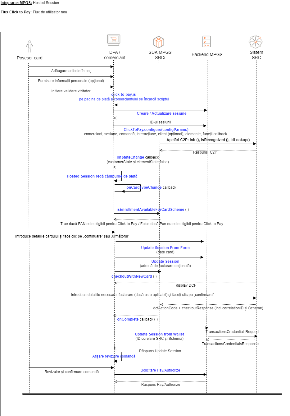 Următoarele figuri ilustrează fluxurile legate de cele trei scenarii. Pentru mai multe informații despre cum să le integrați, consultați Integrarea Click to Pay Hosted Session.